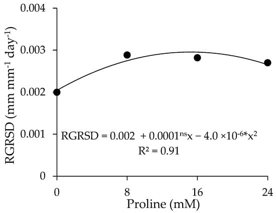 Relative growth rate in stem diameter (RGRSD) of guava cv. Paluma as a function of proline concentrations during the period from 190 to 360 days after transplanting. * significant at p ≤ 0.05 and ns not significant (p > 0.05) according to the F test, respectively.