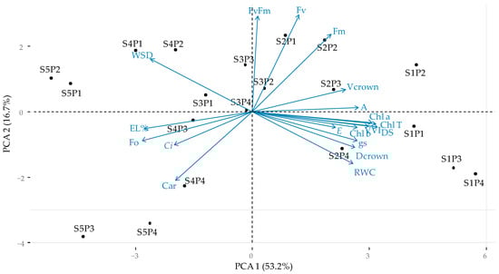 It was found that the second component (PCA 2) provided a contribution of 16.7%, with a strong association of Fv, Fm, and Fv/Fm (0.6242, 0.8539, and 0.8448, respectively) with treatments S2P2, S2P1, and S3P3, which have score values of 2.1306, 2.2656, and 1.3930, respectively. It is also worth mentioning the existence of a strong relationship between the S4P4 treatment (−2.2126) and the Car variable (−0.6101). Treatments S5P3 and S5P4 presented a good contribution to PC2, with scores of −3.7088 and −3.3274; however, they demonstrated low affinity with the variables analyzed (Figure 10).