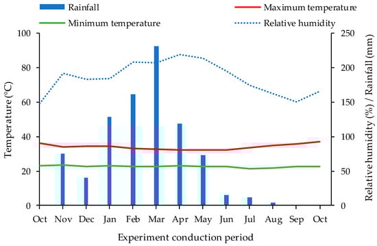 The experiment was conducted from October 2022 to October 2023 under field conditions at the ‘Rolando Enrique Rivas Castellón’ Experimental Farm, belonging to the Center for Science and Agrifood Technology (CCTA) of the Federal University of Campina Grande (UFCG), located in the municipality of São Domingos, Paraíba, Brazil, located at the coordinates 06°48′50″ latitude (S) and 37°56′31″ longitude (W), at an altitude of 190 m. During the experimental period, relative humidity and temperature (maximum and minimum) data were collected through the weather station of São Gonçalo, as presented in Figure 11.