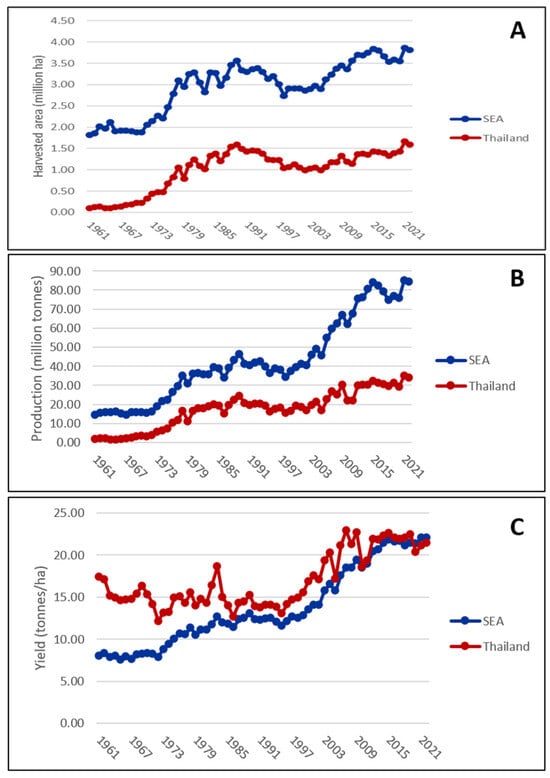 Annual data for cassava harvested area (A), production (B) and yield (C) in Thailand and Southeast Asia Countries [11].