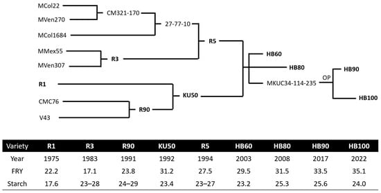 Later in 1994, R5, from a cross between 27-77-10 and R3, was released by DOA with characteristics of high HI and high total biomass yield. Since R5 and KU50 are genetically unrelated based on the available pedigree information (Figure 3), the cassava breeding program at Kasetsart University focused on a cross between them. As a result, Huaybong 60 (HB60) and Huaybong 80 (HB80), having high FRY, HI, SC and total biomass yield, were released in 2003 and 2008, respectively. These two varieties were siblings from a cross between KU50 and R5 [23]. In addition, HB90 and HB100, released in 2017 and 2022, were also from the open-pollinated MKUC34-114-235 line, which was derived from the same cross as HB60 and HB80, as shown in Figure 3 [64].
