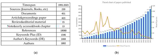 Bibliometric analysis stands as a pivotal research methodology that utilizes statistical and mathematical tools for the thorough examination of literature, aiming to attain an exhaustive understanding of a designated topic area. Bibliometric analysis focuses on the qualitative and quantitative evaluation of publications within databases through the application of statistical and computational techniques [31,32,33], which process enables researchers to gauge the number, quality, and interconnectedness of academic works [34]. Moreover, it sheds light on collaborative trends across journals, countries, and organizations, enhancing our understanding of the organizational framework, influence dynamics, and leading contributors in a specific field of study. Additionally, this method plays a crucial role in the ongoing monitoring and analysis of keywords, assisting in the recognition of emerging trends and shifts within a research domain.