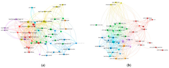 Institutions coupling analysis of oat. (a) drought stress (f ≥ 3). (b) salt stress (f ≥ 3). Dots indicate the number of papers published by institutions. The larger the node, the more papers published. The width of the connecting line indicates the cooperation frequency between institutions. The thicker the connecting line, the higher the cooperation frequency.