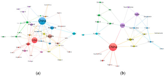 Distribution of oat papers in countries/regions from 1993 to 2023. (a) drought stress; (b) salt stress. The size of a node indicates the number of papers published in each country. The larger the node, the more papers will be published, and vice versa. The width of the connecting line between nodes indicates the cooperative relationship between countries. The thicker the connecting line, the closer the cooperative relationship, and vice versa.