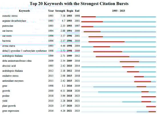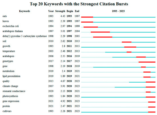 The frequency of citations a publication receives is often reflective of its impact and quality, both nationally and internationally. The analysis curated the top 20 cited papers on the response of oat to drought stress and salt stress, respectively, as recorded in the Web of Science platform (Table 7 and Table 8). These top 20 cited papers on the response of oat to drought stress and salt stress have some similarities in their research areas, which can be roughly summarized as: