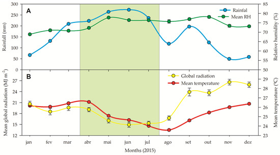 (A) Rainfall (blue symbols) and relative humidity (green symbols). (B) Global radiation (yellow symbols), and temperature (red symbols) measured during the experiment in a restructuring Brazilian Atlantic Forest fragment. All data were organized to show the rainy (green box) and dry season. Source: INMET [13], free access.