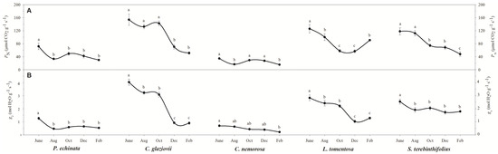 Net photosynthesis (PN; (A)) and stomatal conductance (gs; (B)) of Paubrasilia echinata, Chorisia glaziovii, Clusia nemorosa, Licania tomentosa, and Schinus terebinthifolia plants grown in the natural environment in 2014/June to 2015/Feb in accord of a historical rainfall gradient, in Paulista, Pernambuco, Brazil. Different letters denote significant differences for each month within each seasonal event (SNK, p ≤ 0.01). The values represent the mean of ten biological replicates (±SE).