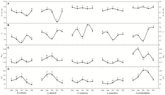 The dissipation of energy from photons captured by the antenna complexes in the form of heat (Figure 3B–D) is another indication of an overloaded photosystem. In this sense, we found that all species showed greater heat dissipation in the driest months of the year, with emphasis on the S. terebinthifolia species, which increased its D from 0.37 (in June) to 0.82 (in February), an increase of 2.2-fold if we consider the June value; however, considering the October values, at the beginning of the critical dry period, this increase is 4.1-fold. C. nemorosa was another species that greatly increased the release of energy in the form of heat as it fluctuated from 0.43 (in June) to 0.94 in December and to 0.65 in February, a significant increase of 2.2- and 1.5-fold, respectively. P. echinata, C. glaviovii, and L. tomentosa showed a decrease in D in October. Still, the February value is not significantly different from the initial value in June, demonstrating that the stress due to the water deficit may have been lower in these species. It is known that these species have a more robust root system, which may have influenced the plant’s resistance in the most critical periods of the year after an abrupt decrease in precipitation was shown in October. The current PSII efficiency (ΦPSII; Figure 3C) during exposure to sunlight showed that, except for the species L. tomentosa and S. terebinthifolia, the other species did not show a significant change in ΦPSII. The ΦPSII values obtained in February for the species L. tomentosa and S. terebinthifolia are 39.3% and 63.2% lower than those verified in August. The electron transport rate (ETR; Figure 3D) showed a different curve than expected since the highest values were measured in the driest months, and the values obtained in February are not significantly different from the values captured in June, except the species P. echinata which showed a 51% lower ETR in February compared to June.