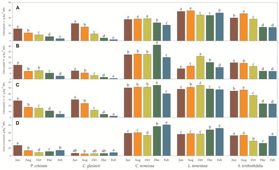 Chlorophyll “a” (A), “b” (B), total (C) and total carotenoids (D) of Paubrasilia echinata, Chorisia glaziovii, Clusia nemorosa, Licania tomentosa, and Schinus terebinthifolia plants grown in natural environment in 2014/June to 2015/Feb in accord of a historical rainfall gradient, in Paulista, Pernambuco, Brazil. Different letters denote significant differences for each month within each seasonal event (SNK, p ≤ 0.01). The values represent the mean (±SE) (n = 10).