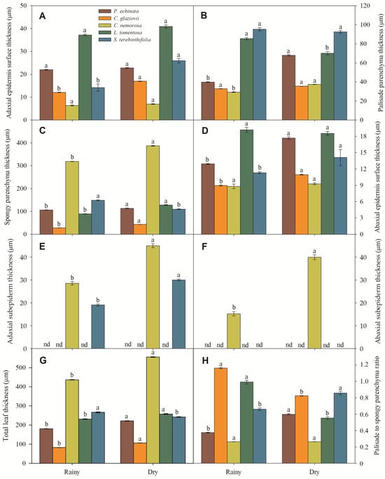 Adaxial epidermis surface thickness (A), palisade parenchyma thickness (B), spongy parenchyma thickness (C), abaxial epidermis surface thickness (D), adaxial subepidermis thickness (E), adaxial subepidermis thickness (F), total leaf thickness (G), and palisade to spongy parenchyma ratio (H) of Paubrasilia echinata, Chorisia glaziovii, Clusia nemorosa, Licania tomentosa, and Schinus terebinthifolia plants grown in natural environment in 2014/June to 2015/February in accord of a historical rainfall gradient, in Paulista, Pernambuco, Brazil. Different lowercase letters denote statistical differences between seasons within the same species (SNK, p ≤ 0.01). The values represent the mean (±SE) (n = 50).
