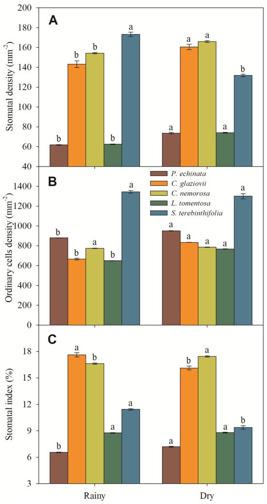 Morphologically, all evaluated species are hypostomatic. In P. echinata and C. nemorosa, the stomata are paracytic with kidney-shaped guard cells. In C. glaziovii, the stomata are paracytic with abundant deposition of waxes, covering part or almost all of the ostiole. In L. tomentosa, the stomata are staurocytic with stomata located slightly above the other epidermal cells, and in S. terebinthifolia the stomata are paracytic, showing very large opened ostioles in rainy season and abundant waxes in the dry season. Also, in the dry season, these stomata often are covered with dense absorbent trichomes. The stomatal density ranged from 62.4 mm−2 (L. tomentosa) to 173.2 mm−2 (S. terebinthifolia) in rainy-season plants and from 74.1 mm−2 (L. tomentosa) to 165.9 mm−2 (C. nemorosa) in dry-season plants (Figure 7A). In ABA, the ordinary cell density ranged from 666.2 mm−2 (C. glaziovii) to 1343.9 mm−2 (S. terebinthifolia) in the rainy season and from 768.2 mm−2 (L. tomentosa) to 1299.9 mm−2 (S. terebinthifolia) in dry-season plants (Figure 7B).