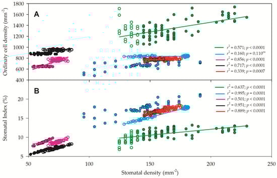 Relationship between stomatal density and ordinary cell density (A) and stomatal density and stomatal index (B) of Paubrasilia echinata (black symbols), Chorisia glaziovii (cyan symbols), Clusia nemorosa (red symbols), Licania tomentosa (pink symbols), and Schinus terebinthifolia (green symbols) plants grown in rainy (closed symbols) and dry (open symbols) natural environment in 2014/June to 2015/Feb in Paulista, Pernambuco, Brazil. Regression coefficients (r2) and p values are shown. (n = 50).