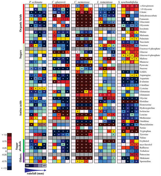 Heat map representing all metabolites in Paubrasilia echinata, Chorisia glaziovii, Clusia nemorosa, Licania tomentosa, and Schinus terebinthifolia plants grown in natural environment in 2014/June to 2015/February in accord of a historical rainfall gradient, in Paulista, Pernambuco, Brazil. The color code of the heat map is given at the log(2) scale. Data are normalized with respect to the mean response calculated for control rainfall (341, 114, 80, 72, and 69 mm in June/14, August/14, February/15, October/14, and December/14, respectively). To allow statistical assessment, individual plants from this set were normalized in the same way. Values represent means of five biological replicates. Cells in gray denote non-detectable metabolites. An asterisk (*) indicates that the values from other samples are significantly different from controls.