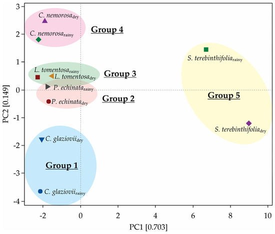 Principal component analysis showing the clustering of the species in accordance with similarities.