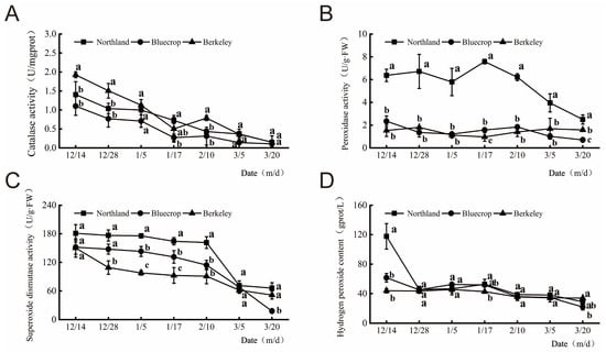 Antioxidant enzyme activity and hydrogen peroxide content in the three blueberry cultivars under winter and early spring conditions. A total of 7 stages were tested. Changes in catalase activity (A), peroxidase activity (B), superoxide dismutase activity (C), and hydrogen peroxide content (D) in the shoots of three blueberry cultivars during the overwintering period. Different small letters indicate significant differences when comparing the cultivars with each other during the same stage (Duncan’s multiple range test, p < 0.05, n = 3).