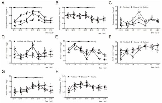 Osmotic regulating substance content in the three blueberry cultivars under winter and early spring conditions. A total of 7 stages were tested. Changes in free proline content (A), soluble sugar content (B), fructose content (C), glucose content (D), sucrose content (E), starch content (F), protein content (G), and cellulose content (H) in the shoots of the three blueberry cultivars during the overwintering period. Different small letters indicate significant differences when comparing the cultivars with each other during the same stage (Duncan’s multiple range test, p < 0.05, n = 3).