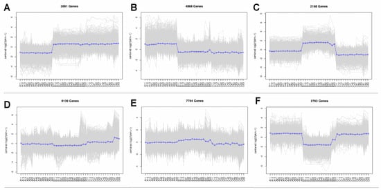 In addition, K-means cluster analysis was performed, and all DEGs were clustered into six groups, as shown in Figure 3. This analysis showed the gene expression changes under cold stresses in all samples. According to the gene expression trends, 3091 genes (subcluster 1) displayed higher expression in the ‘Bluecrop’ and ‘Berkeley’ cultivars (Figure 3A). The results of subcluster 2 indicated that 4868 genes were more highly expressed in the ‘Northland’ cultivar (Figure 3B). The 2168 genes in subcluster 3 were evidently more highly expressed in the ‘Bluecrop’ cultivar (Figure 3C). The results of subcluster 4 indicated that 8130 genes were more highly expressed in the ‘Northland’ and ‘Berkeley’ cultivars (Figure 3D). The 7704 genes in subcluster 5 were evidently more highly expressed in the ‘Bluecrop’ cultivar (Figure 3E). In subcluster 6, 2763 genes were expressed at lower levels in the ‘Bluecrop’ cultivar (Figure 3F). These results indicate apparent differences among cultivars in the responses of the genes and pathways to cold stress.