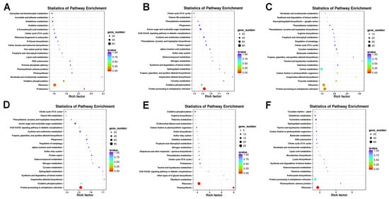 To determine the functional significance of the transcriptional changes in each cultivar, KEGG enrichment analysis was performed with the genes of the six subclusters (Figure 4). In subcluster 1, the DEGs were enriched in the ribosome and proteasome pathways (Figure 4A). In subclusters 2 and 4, the DEGs were enriched in the protein processing in the endoplasmic reticulum pathway (Figure 4B,D). The DEGs in subcluster 3 were enriched in the protein processing in the endoplasmic reticulum and ribosome pathways (Figure 4C). The DEGs were enriched in the photosynthesis and ribosome pathways in subcluster 5 (Figure 4E). The results of subcluster 6 indicated that the DEGs were enriched in the photosynthesis antenna protein and ribosome pathways (Figure 4F). These pathways are functionally relevant to this study and may play an important role in cold resistance. Further analysis showed that differentially expressed genes were significantly enriched in pathways such as ascorbic acid and aldehyde metabolism, glutathione metabolism, citrate cycle (TCA cycle), and glycolysis/gluconeogenesis.