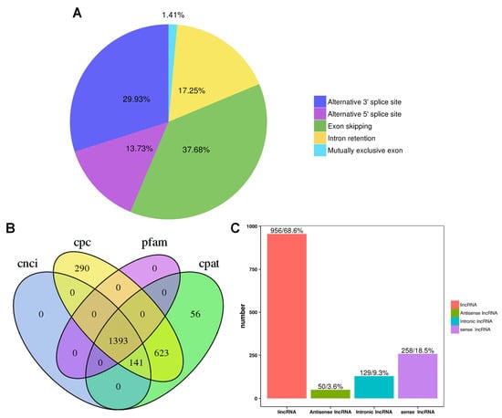Alternative splicing and lncRNA analysis. (A) Classification of alternative splicing events and the proportions of each type of alternative splicing. (B) The numbers of lncRNAs determined by four software analysis programs. (C) Proportions of the four kinds of lncRNAs classified.