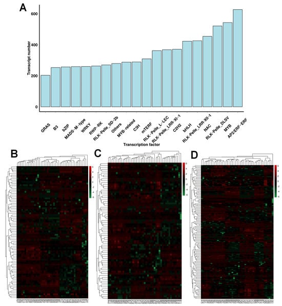 The number of TFs. (A) A total of 12747 TFs were distributed in 20 families. Heatmaps of the relative expression levels of NAC (B), WRKY (C), and ERF (D).