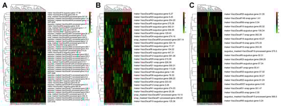 A total of 106 calcium-related DEGs were identified in our research (Table S9). Forty-eight DEGs were classified as being involved in calcium ion binding (GO:0005509) (Figure 7A), including the genes encoding calcium-binding protein CML27, calcium-binding protein CML13, calcium-binding protein CML19, calcium-binding protein CML11, and calcium-binding protein CML42. Eight calcium-binding proteins, including CML50, CML49, and CML48, were identified and classified as being involved in calcium-dependent cysteine-type endopeptidase activity (GO:0004198) (Figure 7B). In the calcium-transporting ATPase activity term (GO:0005388) (Figure 7C), 22 cation-transporting ATPase genes were found, including calcium-transporting ATPase 1, calcium-transporting ATPase 3, calcium-transporting ATPase 9, calcium-transporting ATPase 13, and calcium-transporting ATPase 4. In calmodulin-dependent protein kinase activity term (GO:0004683), 28 calcium-dependent protein kinases (CDPKs) were identified. Evidently, the CDPKs were differentially expressed among the three cultivars. For example, snap_masked-VaccDscaff1-processed-gene-295.22, maker-VaccDscaff10-augustus-gene-135.36, and snap_masked-VaccDscaff27-processed-gene-19.10 were more highly expressed in the ‘Bluecrop’ cultivar. In addition, maker-VaccDscaff53-augustus-gene-5.27, maker-VaccDscaff23-augustus-gene-5.20, maker-VaccDscaff43-augustus-gene-254.20, and maker-VaccDscaff5-augustus-gene-275.26 had higher expression in the ‘Berkeley’ cultivar.