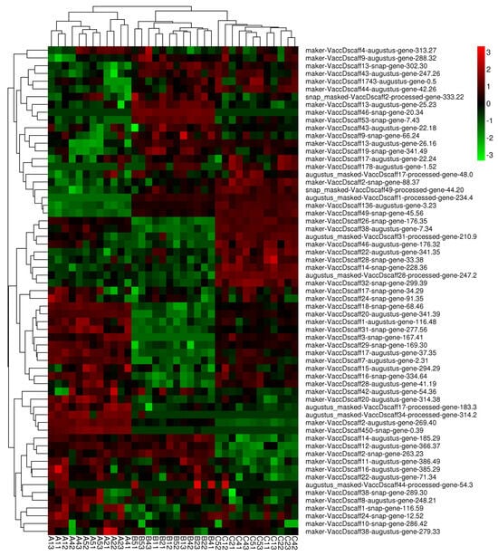 First-strand cDNA was synthesized using the HiScript 1st Strand cDNA Synthesis Kit (Perfect Real Time) (AORT-0060; Gizen organism, Shanghai, China) following the manufacturer’s instructions. qPCR was performed using AceQ qPCR SYBR Green Master Mix (Q121-02; Gizen organism, Shanghai, China) on a LightCycler 480 II Touch fluorescence quantitative PCR instrument (Touch, Beijing, China). The RT-qPCR reaction was performed in a 10 μL system with VcUBC28 as the internal reference [70]. The primers used are shown in Table S12. The cycle threshold (Ct) 2−ΔΔCT method was used for the relative quantification of mRNA. The reaction was set up for three repetitions.