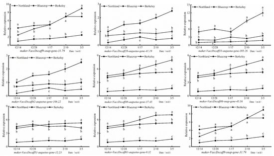 Validation of 9 selected DEGs via qRT-PCR. VcUBC28 was used as an internal control. The values are means (±) SDs of three independent biological repeats. Different small letters indicate significant differences when comparing the cultivars with each other during the same stage (Duncan’s multiple range test, p < 0.05, n = 3).