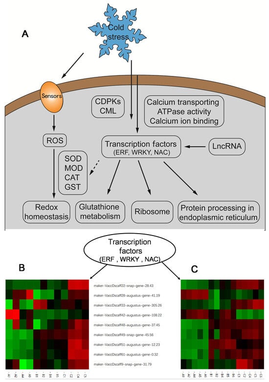 Calcium (Ca2+) is an important secondary messenger in plant cells and has been found to be involved in the response and adaptation of plants to external stresses [50]. In plant cells, the level of Ca on the cell membrane increases significantly in response to various abiotic stresses. As an important mediator, calcium can participate in the perception and transmission of various stress signals through its downstream calcium-binding proteins, thus triggering a series of biochemical reactions to adapt to or resist various stresses. A study demonstrated that Ca2+ plays an important role in improving cold resistance in plants and maintaining the stability of the membrane system [51]. Calcium-dependent protein kinases (CDPKs) participate in the intermediate process instead of functioning in the initial response to cold stress. Moreover, several Ca2+-related genes, such as CDPK13, are regulated by low-temperature stress in plants. A rice line with CDPK13 overexpression exhibited stronger cold tolerance and a higher rate of plant recovery from cold stress, indicating that CDPK13 may be a central protein in the cold stress response signaling network in rice [52]. A total of 106 calcium-related genes were identified and found to be differentially expressed; these genes included those encoding calcium-binding protein CML27, calcium-binding protein CML13, calcium-binding protein CML19, calcium-binding protein CML11, and calcium-binding protein CML42. Specifically, 28 calcium-dependent protein kinases (CDPKs) were differentially expressed among the three cultivars. We speculated that CDPKs might be key proteins in the response to low-temperature stress. In addition, maker-VaccDscaff53-augustus-gene-5.27, maker-VaccDscaff23-augustus-gene-5.20, maker-VaccDscaff43-augustus-gene-254.20, and maker-VaccDscaff5-augustus-gene-275.26 had higher expression in the ‘Berkeley’ cultivar, which are the reasons why the ‘Berkeley’ cultivar has stronger cold resistance than the other two cultivars.