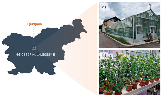 Location of the experiment: (a) The greenhouse where the experiment was conducted and (b) potato plants in a growth chamber.
