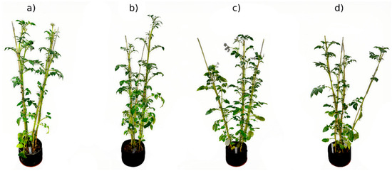Plants of both cultivars at the end of experiment. (a) Well-watered KIS Krka, (b) water-deficient KIS Krka, (c) well-watered KIS Savinja, and (d) water-deficient KIS Savinja. Plants from neither cultivar showed exceedingly expressed symptoms of drought stress.