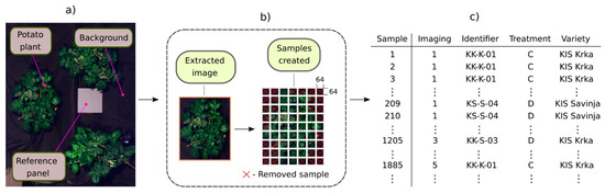 Image preprocessing included six steps (Figure 3): (1) images were radiometrically calibrated to radiance units (W sr−1m−2) using Hyspex proprietary software (HyspexRad v3.1); (2) images were converted to reflectance using the reference panel; (3) VNIR and SWIR images were co-registered to produce one single reflectance image (as in [53]); (4) image segmentation–extraction of leaf-area pixels, whereas background pixels were set to zero; (5) extracted images were further sliced into smaller images of size 64 × 64 pixels (referred to as samples), similar to [44,45]; (6) first and last five spectral channels of both VNIR and SWIR were removed (428 bands left after removal). Reflectance values of all pixels were capped in range , where , in case any of the pixels were saturated. With mathematical notation, the sample shape can be expressed as , where is the number of channels and are the height and width, respectively. Additionally, samples covering less than 90% of the plant’s extents were removed, so number of samples varied among plants. Steps (2)–(5) were performed by using open-source software (SiaPy v0.1.1) [54,55], following methodology described in [24]. To each sample, the following attributes were assigned: “Imaging”, “Identifier”, “Treatment”, and “Variety” (Figure 3). “Imaging” denotes the week of the imaging session (1–5); “Identifier” is the unique label of the potato plant (KK-K-XX, KK-S-XX, KS-K-XX, and KS-S-XX, where XX is a number); “Treatment” defines water irrigation regime (C or D), and “Variety” is the cultivar (KIS Krka or KIS Savinja).