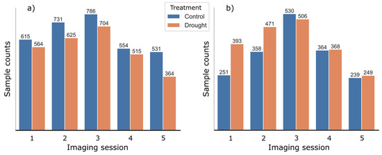 Number of well-watered (control) and water-deficient (drought) samples per imaging session for (a) KIS Krka and (b) KIS Savinja.