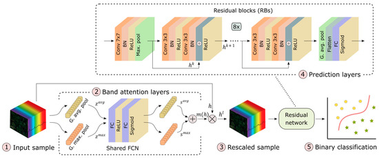 We implemented a convolutional neural network (CNN) with attention mechanism for identification of water-deficient plants, as shown in Figure 5. The model was constructed of five parts: (1) the network took a sample (see resizing process under augmentation techniques); (2) the sample was processed through band attention layers (see Section 2.7, Band Attention), where significance values of each spectral band were extracted; (3) by multiplying the original input sample with these significance values, a rescaled sample was produced; (4) this was fed into a residual network, which converted it through multiple residual blocks into complex latent features, and based on these outputs, a predicted value was generated; (5) the sigmoid activation function was used to constrain the calculated predicted value to range [0, 1]. Therefore, the output of the model was a continuous score, i.e., the probability of the plant being exposed to water-deficient conditions, which can then be categorized into a binary score (0: well-watered and 1: water-deficient) with a threshold value of 0.5.