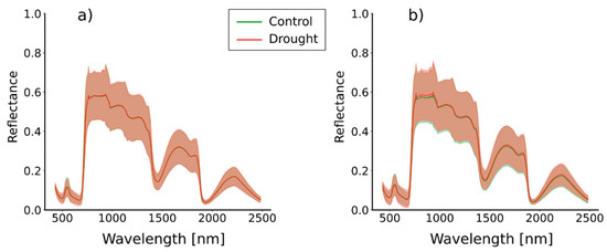 Average spectral signatures calculated from entire potato plants (Figure 6) exhibit high reflectance in the blue (around 400–500 nm) and red (around 600–700 nm) ranges of the VNIR part of the spectrum. In near-infrared (around 700–1300 nm), the plants exhibit a strong peak in reflectance. There are also two relative peaks in the SWIR part of the spectrum (around 1600–1900 nm and 2200–2350 nm). Noticeable differences between the two treatments are not exhibited for either variety. The ribbon representing standard deviations is generally wider for KIS Savinja. For instance, at 650 nm, the ribbon stretches for 0.12, whereas for KIS Krka, it only stretches for 0.07. Nonetheless, there are notable differences in leaf water potential measurements between the two treatments (see Table A1 and Table A2 in Appendix A). The p-values in these tables indicate significant differences as determined by a t-test.