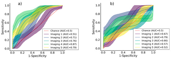 ROC curves for varieties (a) KIS Krka and (b) KIS Savinja, generated based on UD-SS. Mean values and standard deviations are represented with solid lines and ribbons, respectively. Each imaging session is depicted with one arbitrary color and random prediction with dashed red line. Mean values of AUCs are written inside brackets next to annotations of imaging sessions.