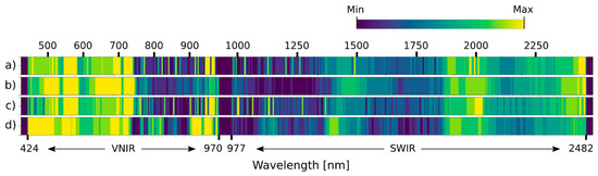 Relevance of spectral bands as determined by band attention module, for KIS Savinja. (a) UD-SS, (b) UD-RS, (c) 3. BDT-SS, and (d) BDI-SS. The brighter the color, the more significant the spectral channel.