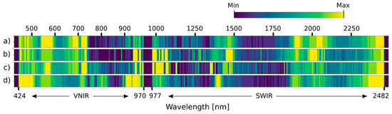 The spectral channels were arranged by their relevance (Figure 8 and Figure 9) to assess which parts of the wavelength spectrum provided the most information. The selected spectral bands varied among the datasets used for either variety. However, some parts of the spectrum were more pronounced than others. For instance, the most prominent wavelengths in the VNIR part were in the ranges 475–580 nm, 660–730 nm, and 940–970 nm; and in the SWIR part, they were 1420–1510 nm, 1875–2040 nm, and 2350–2480 nm. For KIS Krka, the relevance scores of UD-SS were the most similar to BDT-SS and the most different compared to UD-RS. For KIS Savinja, the relevance scores of UD-SS were not similar to any other dataset. There were also discrepancies between varieties. For example, more significant areas were covered in the range 980–1050 nm for KIS Krka than for KIS Savinja. Regardless, relevant spectral bands were similar for both varieties, when compared to UD-SS, especially when compared to the VNIR part of the spectrum. There were, however, some minor differences in the entire SWIR part of the spectrum, with the most notable ones being in the ranges 1100–1500 nm, 1900–2050 nm, and 2350–2430 nm.
