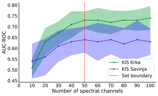 It was empirically determined that at least 50 spectral bands (Figure 10), covering the VNIR and SWIR parts of the wavelength spectrum, were needed to achieve negligible differences compared to UD-SS with all the spectral bands left intact. Generally, using fewer spectral bands translates to worse classification metrics, whereas more than 50 spectral bands cause the metrics to stay approximately constant. The detailed metrics are written in Table 10 and Table 11 for the case when the model was trained using 50 spectral bands. Specifically, it achieved an ROC-AUC of 0.73 and 0.64 and F1 scores of 0.65 and 0.61 for KIS Krka and KIS Savinja, respectively. Most metrics, calculated per imaging session, were also similar in values compared to the values generated on the full spectrum of UD-SS. However, some discrepancies still appeared; for example, the AUC-ROC was decreased to 0.29 in imaging 1 for KIS Krka. Also, the AUC-ROC was decreased to 0.55 (imaging 3) and 0.47 (imaging 4) and increased to 0.78 (imaging 1) and 0.72 (imaging 5) for KIS Savinja.