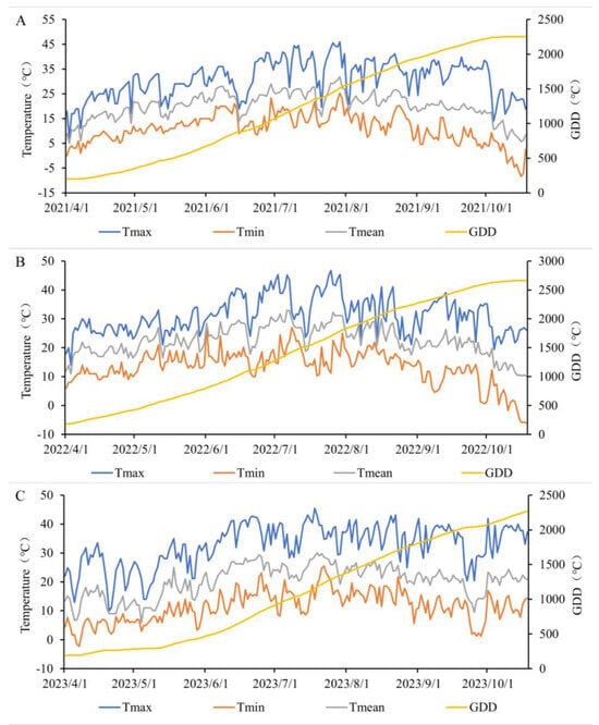 Temperature changes during the growing season of jujube tree in 2021 (A), 2022 (B), and 2023 (C).