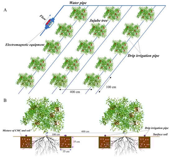 - Shao, F.; Yan, H.; Lin, S.; Wang, Q.; Tao, W.; Wu, J.; Su, L. Magnetically treated water drip irrigation combined with carboxymethyl cellulose (CMC) application: A regulating strategy for enhancing the jujube yield and quality in southern Xinjiang of China. Sci. Hortic. 2024, 326, 112723. [Google Scholar] [CrossRef]