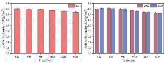 Under magnetically treated water drip irrigation with microbial organic fertilizer, all treatments showed a reduction in the soil bulk density (BD) compared to the control (CK, BD = 1.61 g/cm3) in 2021 (Figure 3). The BD for treatments M6 to M24 decreased by 1.86% to 8.07%. This trend continued in 2022, with BD reductions ranging from 0.63% to 8.75% for treatments M6 to M48. In 2023, the BD of CK slightly increased to 1.63 g/cm3, while the BD of the microbial organic fertilizer treatments continued to decrease, with reductions ranging from 3.07% to 11.04% for treatments M6 to M48. Overall, the application of microbial organic fertilizer significantly reduced the soil bulk density, with the degree of reduction positively correlated with the amount of fertilizer applied. These results indicate that microbial organic fertilizer effectively reduces the soil bulk density by increasing the organic matter content and improving soil structure. As the amount of microbial organic fertilizer increased, the reduction in the soil bulk density became more pronounced. This could be because higher application rates of microbial organic fertilizer increase soil organic matter and microbial activity, which in turn improves the soil aggregate structure by enhancing the bonding between soil particles []. This aggregation forms larger soil clumps, reducing the soil bulk density and facilitating root expansion and gas exchange, thereby promoting plant growth [].