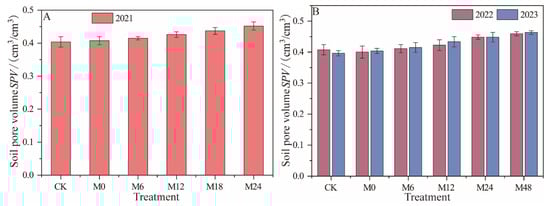 Under magnetically treated water drip irrigation with microbial organic fertilizer (Figure 4), SPV (Soil Pore Volume) increased by 2.72% to 11.88% for treatments M6 to M24 compared to CK in 2021 and by 1.97% to 11.06% compared to M0, indicating a significant improvement in SPV due to microbial organic fertilizer. In 2022, the SPV of CK was 0.407 cm3/cm3. Among the microbial organic fertilizer treatments, M48 showed the highest increase in SPV, reaching 0.459 cm3/cm3, which was 12.78% and 14.75% higher than CK and M0, respectively, demonstrating the positive long-term effect of microbial organic fertilizer on soil porosity. In 2023, the treatments with microbial organic fertilizer continued to show an increase in SPV, especially at higher application rates. The SPV of the M48 treatment reached the highest value of 0.463 cm3/cm3, which was 16.92% and 14.60% higher than CK and M0, respectively, further confirming the long-term contribution of microbial organic fertilizer to enhancing soil porosity. Microbial organic fertilizer improves the physical structure of the soil by increasing organic matter content and microbial activity. These microbes not only decompose organic matter in the soil, producing colloidal substances that help soil aggregation, but also increase the proportion of curved macropores in desert soils through their biological activity []. These pores are crucial for the flow of water and air, improving the soil’s water retention capacity and the rhizosphere environment. As the application rate of microbial organic fertilizer increases, particularly at higher rates, this improvement becomes more pronounced, enhancing soil quality and promoting plant growth.