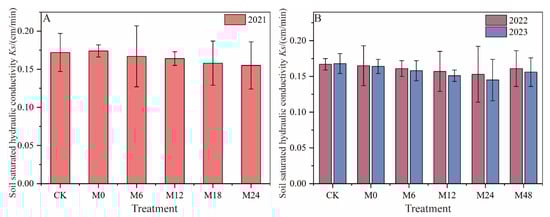 Under magnetically treated water drip irrigation with microbial organic fertilizer, the saturated hydraulic conductivity (Ks) showed a decreasing trend with increasing application rates of microbial organic fertilizer in 2021 (Figure 5). Ks for treatments M6 to M24 decreased by 2.91% to 9.88%, indicating a significant effect of microbial organic fertilizer on altering soil physical properties. In 2022, Ks for treatments M6 to M48 decreased by 3.59% to 8.38%. In 2023, the decreasing trend in Ks became more pronounced with increasing application rates of microbial organic fertilizer, with Ks for treatments M6 to M48 decreasing by 5.95% to 13.69%. These results demonstrate that the application of microbial organic fertilizer significantly impacts soil physical properties, particularly in increasing soil organic matter content and altering the soil structure. The organic matter introduced by microbial organic fertilizer may lead to a reduction in the number of macropores and increase soil compactness, thereby reducing Ks. This effect is especially evident at higher application rates of microbial organic fertilizer due to the accumulation of organic matter and enhanced microbial activity. This phenomenon suggests that while microbial organic fertilizer increases soil organic matter content, it may also alter the soil pore structure, affecting soil water mobility and permeability [,].