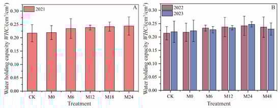 Under magnetically treated water drip irrigation with microbial organic fertilizer, the soil water-holding capacity (WHC) was significantly improved compared to conventional water irrigation (CK), and this effect increased with the application rate of microbial organic fertilizer (Figure 6). In 2021, the soil WHC for microbial organic fertilizer treatments showed a noticeable increase compared to CK (WHC = 0.217 cm3/cm3). Specifically, M6 increased the WHC to 0.235 cm3/cm3, an 8.29% rise; M12 increased the WHC to 0.238 cm3/cm3, a 9.68% rise; and higher application rates (M18 and M24) resulted in increases of 11.52% and 12.44%, respectively. This indicates a dose-dependent relationship between microbial organic fertilizer and an improved soil WHC. In 2022, the positive effects of microbial organic fertilizer remained significant, especially for M24 and M48, which showed increases of 13.08% and 10.75%, respectively. This further confirms the effectiveness of microbial organic fertilizer in enhancing the soil WHC. In 2023, M24 continued to show the highest increase at 12.27%, while the increase for M48 slightly decreased to 4.55%. This suggests that the application of microbial organic fertilizer has a long-term effect on improving the soil WHC, but application rates exceeding 2.4 t/hm2 may result in a negative inhibitory effect.