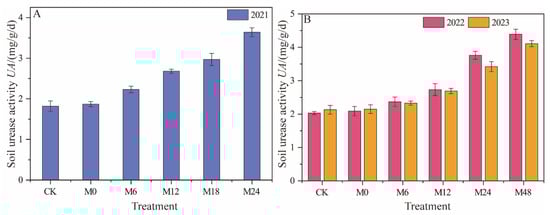 In 2022 and 2023, the M48 treatment exhibited the highest urease activity, suggesting that within a certain range, higher application rates of microbial organic fertilizer more effectively promote microbial activity and urease production. With each passing year, urease activity increased for all treatment groups, possibly reflecting continuous improvements in soil conditions and increased microbial activity. This indicates the potential of microbial organic fertilizer to enhance soil urease activity. Microbial organic fertilizer may enhance urease activity by providing beneficial microbes, increasing soil organic matter content, and improving soil structure and nutrient status. The more pronounced effects observed with higher application rates of microbial organic fertilizer could be related to their greater efficacy in promoting soil microbial community diversity and functionality.