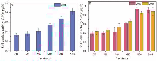 Under magnetically treated water drip irrigation with microbial organic fertilizer, catalase activity significantly increased in 2021 with higher application rates of microbial organic fertilizer. Notably, in the M24 treatment, catalase activity increased by 148.52%, indicating that higher application rates significantly promoted catalase activity (Figure 8). In 2022, all microbial organic fertilizer treatments showed higher catalase activity, especially M24 and M48, which increased by 138.48% and 133.30%, respectively. In 2023, the M24 (0.85 mg/g/h) and M48 (0.88 mg/g/h) treatments again exhibited high activity, with increases of 93.21% and 99.98%, respectively. The increasing trend in soil catalase activity with higher application rates of microbial organic fertilizer, particularly in high-fertilization treatments, suggests that the addition of beneficial microbes in the fertilizer improves soil biological activity and organic matter decomposition, thereby promoting catalase activity. This trend is especially pronounced at medium-to-high fertilizer application rates.