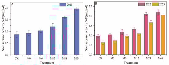 Under magnetically treated water drip irrigation with microbial organic fertilizer, the application of microbial organic fertilizer significantly increased sucrase activity in 2021, with M24 showing an increase of 126.44% (Figure 9). This trend was further confirmed in 2022, where M24 and M48 exhibited the highest increases in activity, at 119.79% and 127.08%, respectively, indicating that higher application rates of microbial organic fertilizer significantly promote soil sucrase activity. In 2023, the sucrase activity of M48 increased to 2.06 mg/g/d, with a remarkable increase of 226.98%, further emphasizing the potential of microbial organic fertilizer in enhancing soil sucrase activity. These results demonstrate that the application of microbial organic fertilizer significantly enhances soil sucrase activity, and this effect increases with higher application rates. This may be due to the beneficial microbes and nutrients in the microbial organic fertilizer, which improve the activity of the soil microbial community and increase the decomposition of soil organic matter, thereby promoting the synthesis and activity of sucrase. Additionally, the year-over-year persistence of this effect highlights the long-term potential of microbial organic fertilizer in improving soil biochemical properties.