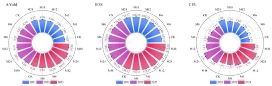 Under magnetically treated water drip irrigation with microbial organic fertilizer, different treatments showed varying effects on the soluble sugar content of jujubes in 2021 (Figure 10). Compared to CK, the soluble sugar content slightly increased in M0, while the increases in M6 and M12 were relatively small. However, M18 and M24 exhibited more substantial increases of 8.60% and 12.11%, respectively, indicating a significant promotion of soluble sugar content by microbial organic fertilizer in these treatments. In 2022, the changes in soluble sugar content with different microbial organic fertilizer treatments were more pronounced. Compared to CK, M0 showed a slight increase, while the increases in M6 and M12 remained small. However, the soluble sugar content in M24 significantly increased to 776.32 mg/g, an 8.08% increase compared to CK. In 2023, the soluble sugar content continued to increase across all treatments. M0 showed further increases compared to the previous two years, while the increases in M6 and M12 remained small. M24 again achieved the highest soluble sugar content at 831.17 mg/g. Notably, although the application rate of microbial organic fertilizer in M48 was twice that of M24, its soluble sugar content in 2022 and 2023 was lower than that of M24. This may be related to a counter-regulatory mechanism triggered by the excessive application of microbial organic fertilizer. First, while the soluble sugar content in M48 was slightly lower than in M24, it was still higher than in CK, indicating that the application of microbial organic fertilizer promoted the accumulation of soluble sugars in jujube fruits to some extent. Second, the performance of M48 might have been affected by the application rate; excessive microbial organic fertilizer does not necessarily result in higher sugar accumulation. This could be because the nutrient absorption capacity of jujubes is limited within a certain range, and excessive microbial organic fertilizer might lead to nutrient wastage or reach the threshold of the trees’ absorption and conversion capacity, no longer significantly promoting sugar accumulation.