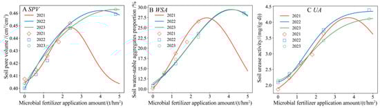 As shown in Figure 11 and Table 5, the Gauss model effectively predicted the soil property indices SPV, WSA, and UA under magnetically treated water combined with different application rates of microbial organic fertilizer. The R2 values between the predicted and measured values ranged from 0.936 to 0.999. Overall, the optimal application rate for microbial organic fertilizer corresponding to SSWCmax varied slightly across different years, ranging from 2.14 to 3.03 t/hm2. The SSWCmax values were relatively close, ranging from 0.406 to 0.414 cm3/cm3. The optimal application rates for SPVmax, WSAmax, and UAmax in 2021 were lower than in 2022 and 2023, likely because the maximum application rate of microbial organic fertilizer in 2021 was only 2.40 t/hm2, causing the Gauss model to predict a lower optimal rate. In 2022 and 2023, the maximum application rate was increased to 4.80 t/hm2, improving the precision of the Gauss model predictions. Except for UAmax in 2023, the optimal application rates for the other indices in 2022 and 2023 ranged from 3.89 to 5.13 t/hm2. From an economic perspective, excluding the higher application rates of 5.86 and 5.13 t/hm2 and averaging the optimal rates for the other indices gives an approximate optimal rate of 3.47 t/hm2. Therefore, from the perspective of comprehensively improving desert soil properties, an application rate of 3.47 t/hm2 is recommended for microbial organic fertilizer. While applying more microbial organic fertilizer can further significantly enhance soil nutrients and microbial activity, excessive application can directly increase production costs and potentially cause soil acidification and environmental pollution.