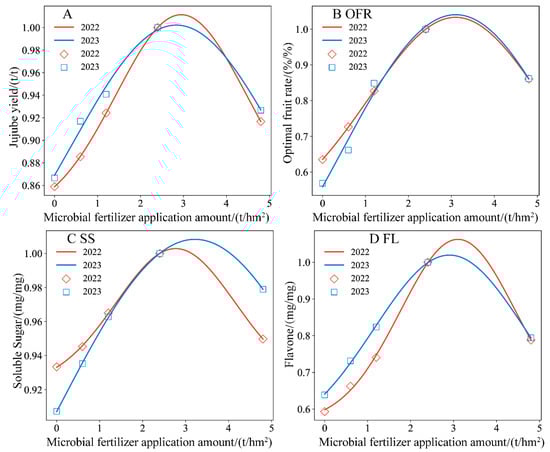 In Figure 12 and Table 6, the Gauss model curves accurately fitted the jujube indices under different application rates of microbial organic fertilizer, with R2 ≥ 0.854 and RMSE ≤ 0.0333. The normalized target values for the microbial organic fertilizer treatments were relatively close, and the peak or trough values and their corresponding optimal application rates were consistent across different years for the same index. For the yield target, the optimal application rates of microbial organic fertilizer were 2.95 and 2.83 t/hm2. For the SS target, the optimal application rates were 2.77 and 3.22 t/hm2. For the FL target, the optimal application rates were 3.10 and 2.90 t/hm2. Overall, the optimal application rate range for microbial organic fertilizer was 2.77 to 3.22 t/hm2. Averaging these optimal rates gives a value of 3.09 t/hm2. Therefore, 3.09 t/hm2 is recommended as the optimal application rate of microbial organic fertilizer to comprehensively improve the yield and quality and reduce water consumption.